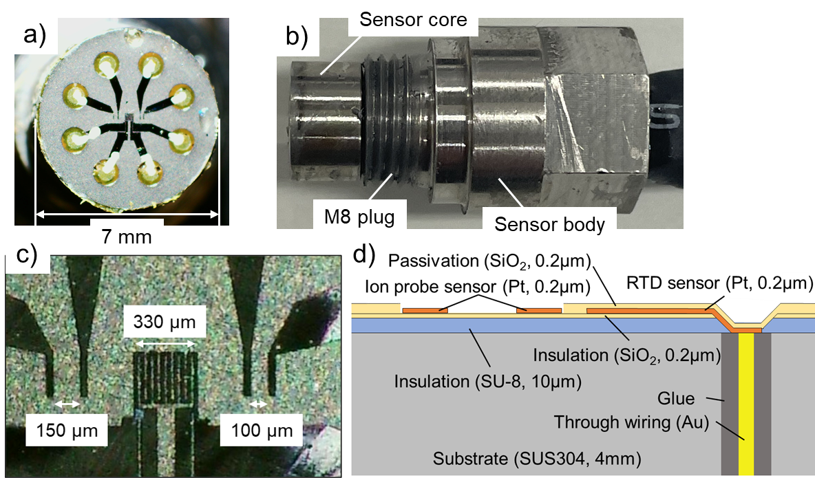燃焼伝熱研究用MEMSセンサと製作時の苦労 まず、開発した燃焼伝熱研究用MEMSセンサについて説明する。センサは、燃焼容器に導入する場合、設置スペースに限りがあるため、センサの小型化が必要となる。また、取り付けや取り外しが容易に行えるよう、燃焼容器と機械的に接合できる形状であることが求められる。そこで本センサは図1のように、直径7 mmの基板上にフォトレジスト塗布、露光、現像、スパッタリング、リフトオフという一連のMEMS技術を用いて薄膜を形成した。センサボディにはおねじ加工を施し、燃焼容器との接合を可能にした。このプラグ型センサは図1 d)に示すように、一辺330 µmの温度を測定する薄膜測温抵抗体(RTD : Resistance Temperature Detector)を中心に火炎挙動を測定する薄膜イオンプローブ(100 µm, 150 µm)を左右に搭載している。これにより、壁面での熱輸送に加え、壁面極近傍での火炎挙動を同時に評価することを目指している。