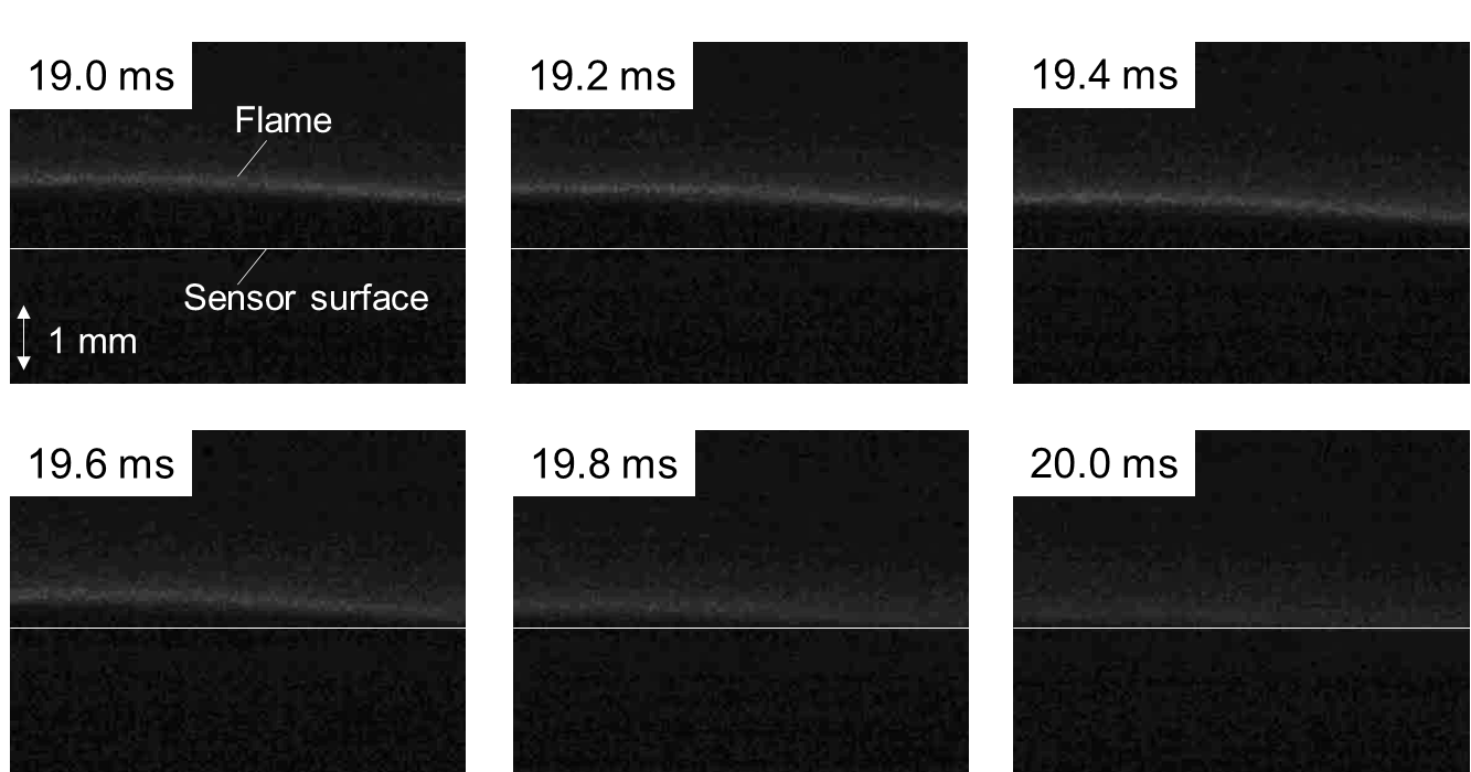 開発したセンサの測定試験を行った。ここでは、燃料にブタン(当量比1)を用いた大気圧燃焼において、火炎が壁面に垂直に衝突するHOQ(Head On Quench)条件で実験を行った。図2にハイスピードカメラ(5000 fps)を用いて撮影した火炎の伝播の様子を示す。また、図3に開発した燃焼伝熱研究用MEMSセンサを用いて計測したイオン電流と熱流束の時系列変化を示す。ここで、図2、図3に示す時刻は、点火信号入力からの時間を示している。図から、イオン電流と熱流束は共に、火炎の接近、すなわち火炎-壁面間距離が短くなると増加することが分かる。その後、イオン電流は電界強度の高い壁面付近にイオンを多く含む火炎反応帯が近づくことで急増し、熱流束も同様に高温の燃焼ガスが壁面に近づき温度勾配が高くなることで増加する。ハイスピードカメラによる撮影画像から判断すると、消炎はイオン電流と熱流束の最大値付近である20.0 ms~20.2 msの間で生じたと推察される。燃焼反応の終了に伴い検出できるイオンが減少するためイオン電流は最大値に達し、立下りを見せる。熱流束も同様に、消炎後立下りを見せることが分かる。ただし、ハイスピードカメラの撮影速度の不足から消炎時刻を明確に決定することは難しく、消炎とイオン電流・熱流束の関係の詳細な調査は今後の課題である。また、消炎後も、既燃部から壁面への熱の流れが存在すると考えられるが、計測された熱流束値は短期間にほぼ0となった。これは、火炎位置を撮影しやすいように奥行き方向に薄い(15 mm)燃焼容器を使用したため、側壁からの冷却が影響した可能性が考えられる。