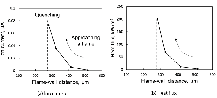 次に、火炎-壁面間距離とイオン電流および熱流束の関係をまとめたものを図4に示す。ハイスピードカメラによる撮影画像をもとに判断すると、今回の測定条件では火炎-壁面間距離が500 µm程度になるとイオン電流および熱流束が上昇を始める結果となった。その後、火炎は壁面まで280 µm程度まで接近し、それに伴いイオン電流および熱流束も増加している。この様に火炎接近から消炎に至るまでのイオン電流と熱流束の時系列変化を同時に取得することができ、火炎の接近によりイオン電流と熱流束が変化することから、検証段階ではあるが、壁面近傍での火炎の挙動を可視化なしで推定し、火炎の挙動と熱流束の関係を調べることが出来る可能性が示された。