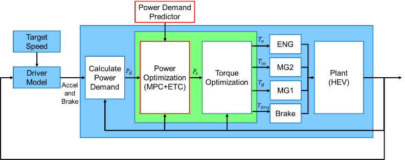 本研究ではエネルギーマネジメントの目的を「soc(State Of Charge)を維持しながら、燃料消費量を最小化すること」とする。また、図1に示すようにパワー最適化器(Power Optimization)では、上流で計算されたドライバーの要求パワーPdriver(t)をもとにエンジンパワーPeng(t)の最適値を計算する。そして、求めたエンジンパワーPeng(t)の最適値をもとに、トルク最適化器(Torque Optimization)でエンジン、モータ、発電機のトルクを計算する。さらに、トルク最適化器で求めたトルクをそれぞれの目標値とし、各コンポーネントでスロットル開度やモータ電流などの具体的な指令値を計算する構成となっている。本研究では、パワー最適化器において提案するロバスト予測制御を使用し、トルク最適化器はHEVモデルに付属されている見本のルールベースのコントローラをそのまま用いる。