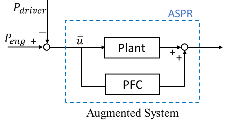 エンジンパワーPeng(t)を入力、ドライバー要求パワーPdriver(t)を外乱、バッテリ充電率soc(t)を出力とみなし、以下のバッテリシステム(1)式を用いて制御系を設計することを考える。