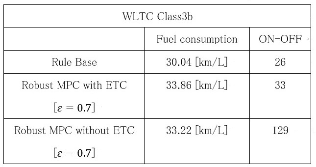 表1にルールベース手法、イベント駆動機構ありの提案手法 [ε=0.7]、イベント駆動機構なしの提案手法 [ε=0.7] で、それぞれWLTC Class3bを走らせた場合の燃費とエンジンのON-OFF回数を示す。
