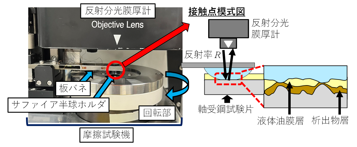 反射分光摩擦面その場観察本研究では摩擦試験機と光学分析装置である反射分光膜厚計を組合わせた「反射分光摩擦面その場観察装置」を用いてしゅう動面に生じた析出物の摩擦中その場分析を行った(図1)。本手法では透明なサファイアを用いて摩擦試験を行うことで、接触点の可視光の反射率スペクトルを摩擦中に測定する。反射率スペクトルを分析することで、接触点に形成される析出物層および液体油膜層を光学特性(屈折率および消衰係数)から区別し、それぞれの厚さを算出することができる。本手法は二液分離油(2)やエステル混合潤滑油(3)の油膜構造のその場分析に対して有効性が示されており、潤滑油中析出物のその場分析に対しても有効であると考えた。