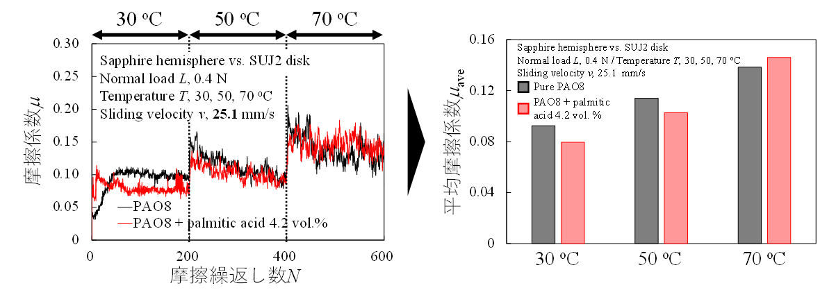 潤滑油試験片の作成と摩擦特性本研究では高性能エンジン油のベース油に使用されるPAO(ポリ-α-オレフィン)を潤滑油試験片のベース油として用いた。析出物として飽和炭化水素であるパルミチン酸(融点62.9 ℃)を4.2 vol.%添加した。30 ℃、50 ℃および70 ℃と順に昇温して摩擦試験した場合のベース油およびパルミチン酸含有試験片の摩擦係数の推移を図2に示す。パルミチン酸含有試験片の摩擦係数はベース油と比較して、融点以下の50 ℃で10 %および30 ℃で14 %それぞれ減少した。低温ではパルミチン酸の析出量が増加すると考えられる。以上よりしゅう動面に生じた析出物が摩擦低減に寄与することが示唆され、摩擦中に測定した反射率スペクトルを解析することで析出物の状態を明らかにした。