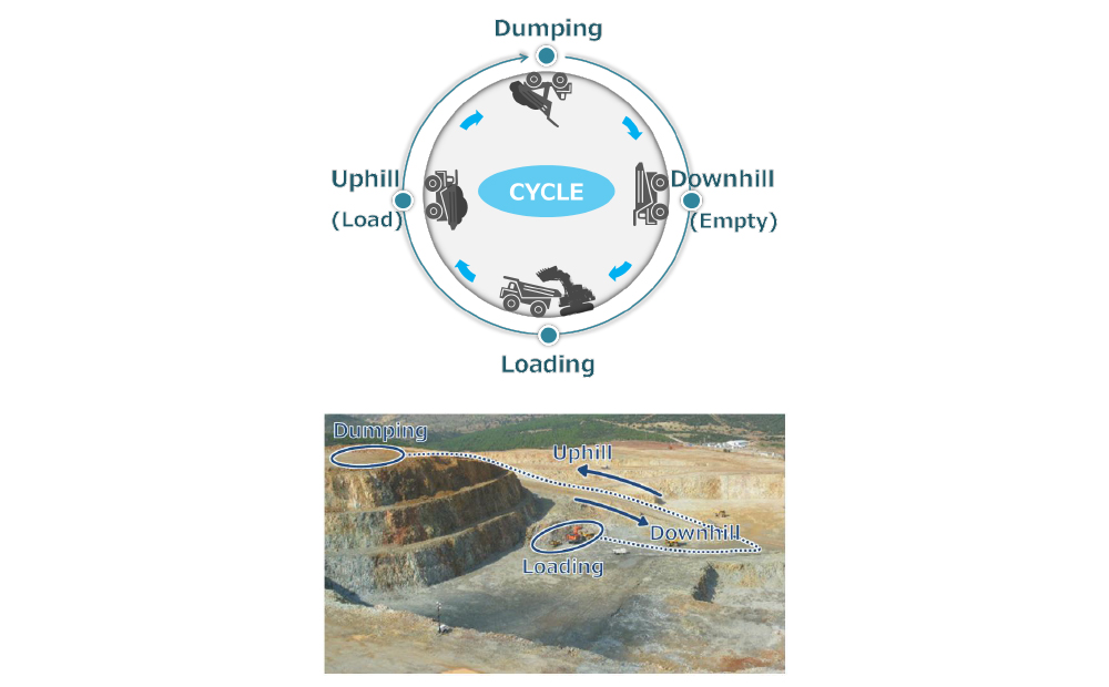 を挙げている。鉱山用ダンプの運用の基本は、素掘りの鉱山の底から積載状態で地表まで登って積載物を降ろしてまた底へ下っていくものという(図1)。こうした運用であるため、登坂時には大電力を必要とする反面、下り坂での回生量は少ない。また、バッテリへの負荷が高く早期の劣化につながりやすくなる。これらの課題を解決する手段としてトロリ式を提案している。トロリ式とすることでバッテリ搭載量と負荷が軽減され上記課題の解決につながるほか、電力インフラにとってはピーク電力の低下につながる効果もあるとしている。試作機(図2)を製作して実証試験を開始するという。