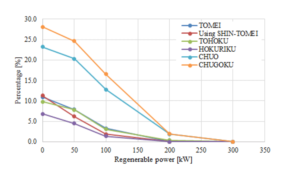 図(図3)は25tトラックが各高速道路を走行した場合に、回生可能電力と回生しきれない頻度について示したものである。200kW回生できれば中央道と中国道で数%のロスがあるものの、それ以外ではほぼ回生できるのに対し、回生可能電力が100kWの場合、一般的な高速道路で数%、中央道で10%以上、中国道で15%以上の時間で回生電力が余剰になる結果であった。また、余剰となる回生電力により走行できる距離についても試算しており、例えば前記25tトラックで回生能力が100kWの場合だと、中央道で約40km、中国道で約90kmになるという。これら回生できないエネルギーを登坂中の車両に供給できれば効果的としている。