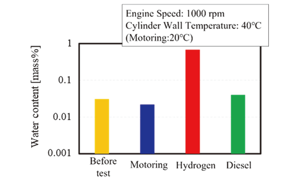 水素燃焼では、燃焼ガスに含まれる水蒸気がガソリン・ディーゼル燃料に比べ多く、シリンダ壁面で凝縮する水分量が多いと言われている。三原ら(1)は、シリンダ壁面の温度の違いによる凝縮水の生成量とその凝縮水が潤滑油へもたらす影響を把握すべく、シリンダ壁温を20℃~80℃まで変化させたときの潤滑油中に含まれる凝縮水割合を調査した。550ccの単気筒ディーゼルエンジンを予混合水素エンジンに改修して使用。シリンダ壁温40℃にて、新油、モータリング、ディーゼル燃焼との比較試験を行い、試験後のオイルをサンプリングして水分混入量を分析した(図1)。新油と比べ20~30倍の水分量が確認された。潤滑性への影響については今後の解析に期待したい。