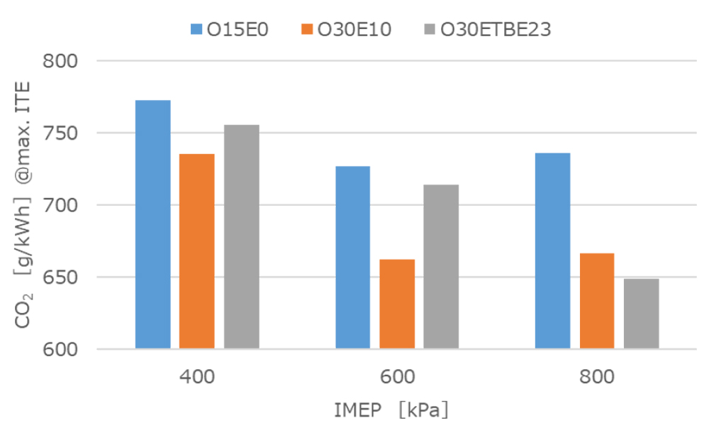 この結果からWLTCモード走行をした際のCO2排出量もシミュレートしており、ハイブリッド車を想定した場合、高熱効率化と合わせて燃料の炭素含有率の低下の効果も加わり、CO2排出量が削減することが示された(図2)。