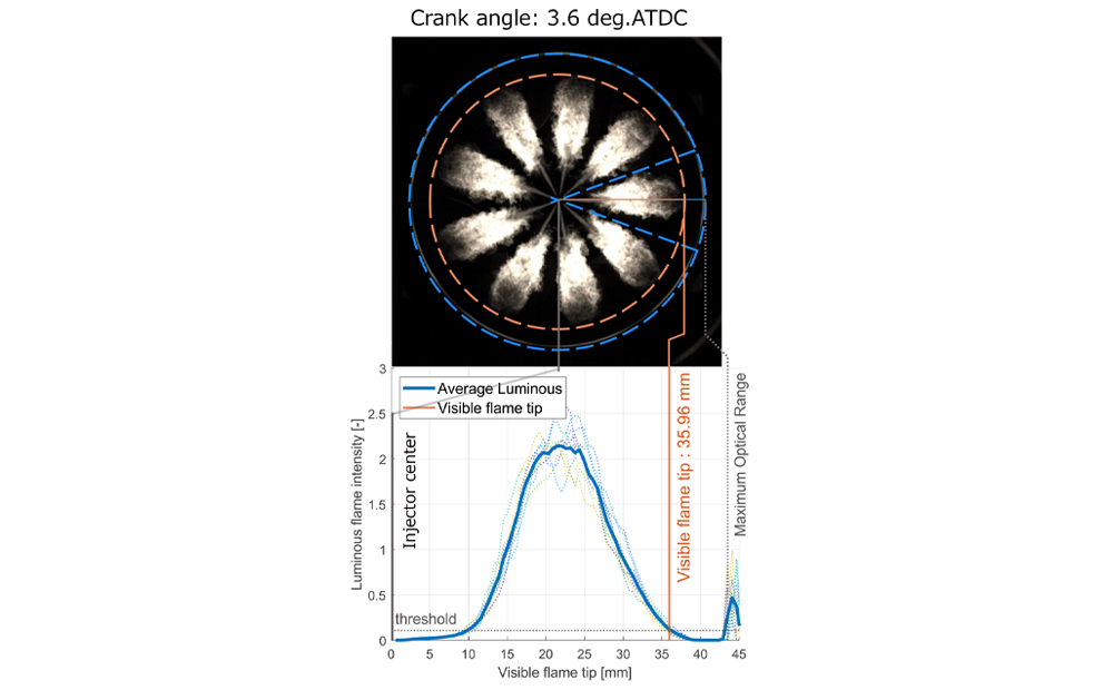 将来のディーゼル燃料の一例として、FT法による合成燃料であるパラフィン系燃料を想定し、蒸留特性、動粘度、セタン価を変化させた7種類の試験燃料(表2)を用いて可視化エンジンにより燃焼状態を観察している。燃焼状態は火炎画像を基に火炎の到達距離と輝度の分布で評価した(図3)。