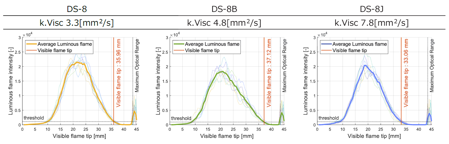 動粘度を変えた燃料DS-8,DS-8B,DS-8Jで比較したところ、DS-8より動粘度の高いDS-8Bでは可視火炎の先端がわずかに伸びたが、さらに動粘度の高いDS-8Jでは逆に先端が短くなった(図4)。この原因として、DS-8BはDS-8に比較して高動粘度により微粒化が抑制されたことにより火炎が伸びたが、DS-8Jは他の2燃料に比べて噴射率が低く噴射時間が伸びているため火炎が壁に衝突するのが遅くなったためとしている。ただし用いた試験燃料系では動粘度を変化させる際に他の物理量(蒸留性状など)も変化しており、原因の詳細な解析はできていない。同様に蒸留特性の違いを比較した際も、燃料の軽質化に伴う蒸発促進による影響と思われる結果(燃焼期間の短縮)が出ていたが、動粘度も同時に低下しており、その切り分けはできていない。