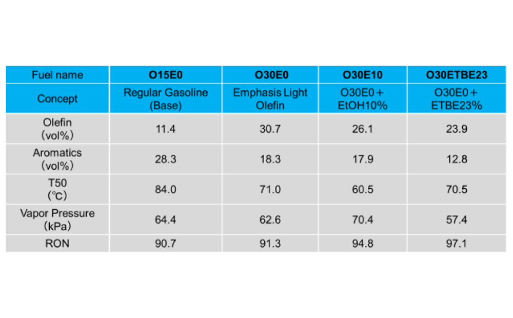 この中で成果の一例としてガソリン研究成果の概要が報告された。本プロジェクトの目的として、「将来の高効率エンジン(ガソリンエンジンならばスーパーリーンバーン等)に適する液体燃料組成(レシピ)を明確にする」ということが挙げられており、オレフィン量と含酸素化合物を変えた試験燃料(表1)を用いて単気筒エンジンで評価した結果が示された。例えば含酸素燃料とオレフィンを強調した燃料はベースのレギュラー燃料よりも様々な負荷においてリーン限界とノック限界が拡大し熱効率が向上した(図1)。