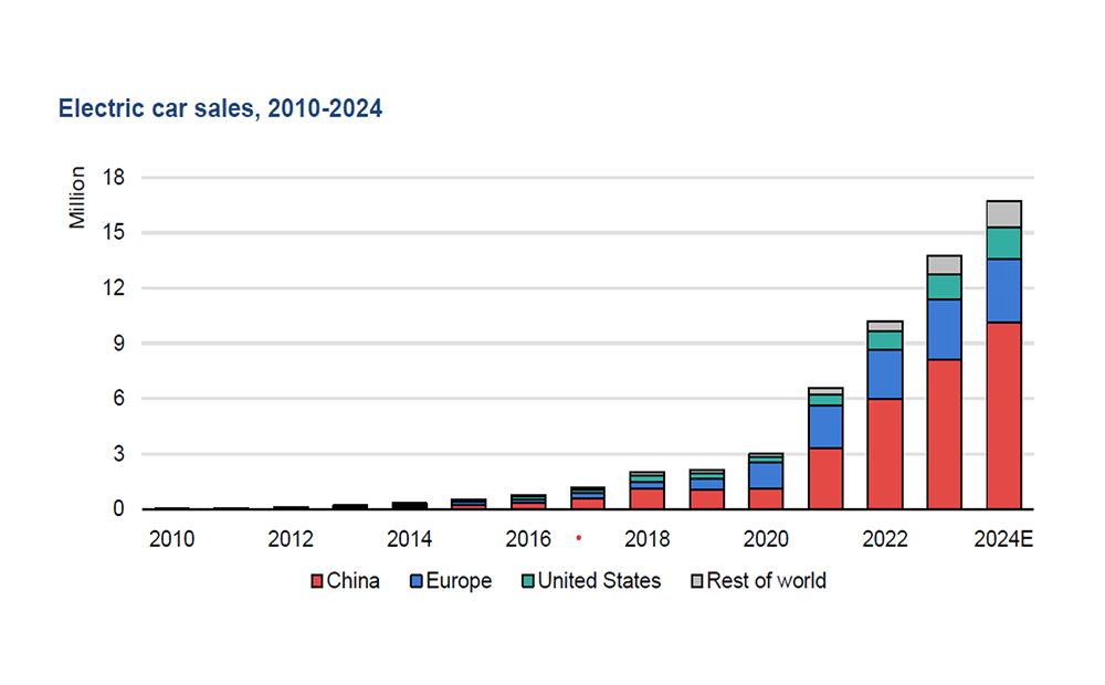 2024年は成長が鈍化し、一時的な「踊り場」を迎えるとの見方もある。しかし、IEAは2024年も引き続き堅調に推移し、新車販売台数は1,700万台に達すると予測する。さらに、2035年には世界の新車販売におけるBEVおよびPHEVの比率が50%を超えるとも予測している。