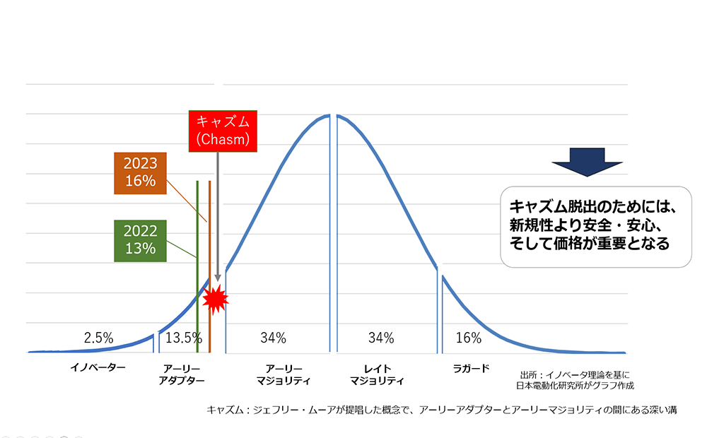 2023年の段階では、世界に於けるBEV/PHEVの新車販売比率は16%に達し、今後はアーリーアダプターからアーリーマジョリティに移行するために、より安全・安心、そして価格が重要となる。その実現のためには多くの技術課題(航続距離、充電技術、バッテリリサイクルなど)を克服しながら、普及が進んでいくと思われる。