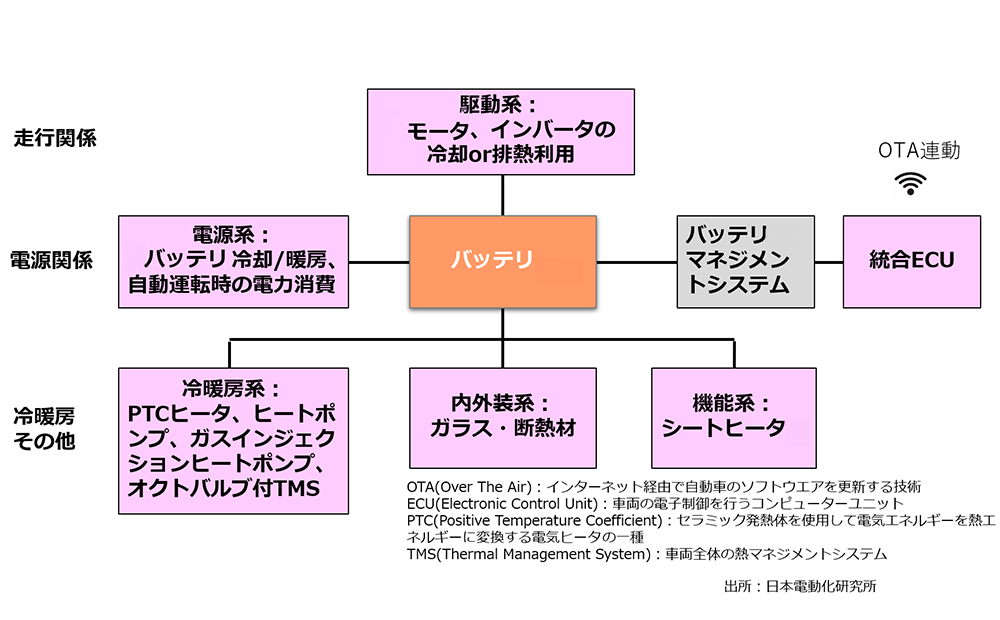もう一つの課題がサーマルマネジメントである。これは、エネルギー源がバッテリに限られるため、冷暖房および放熱等によりロスをいかに少なくするかが重要となる。不十分な場合、例えば寒冷地に於いて、暖房等に多くのエネルギーを費やしてしまい、航続距離が短くなるという事態が生じる。冷暖房以外にも、ガラスによる放熱、デフロスタ機能に於けるエネルギーロス、また近年では自動運転車による機器の電力消費などがあり、エネルギーをいかに有効活用するか、サーマルマネジメントが重要となる