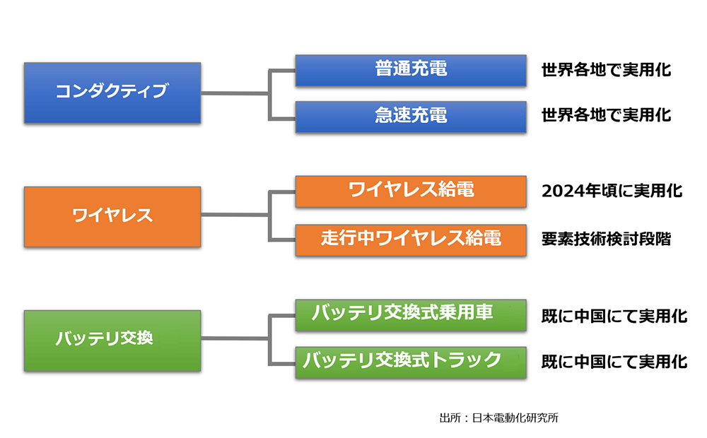充電方式としては、充電コードが繋がった「コンダクティブ」タイプがあり、普通充電と急速充電に分かれる。最近技術開発が進んでいるのが「ワイヤレス」タイプである。非接触のワイヤレス給電は実用化が近く、また走行中ワイヤレス給電については要素技術開発が進んでいる。さらに、中国にて近年普及が進んでいるのが「バッテリ交換」タイプである。既に乗用車やトラックに対し、バッテリ交換ステーションを設置し、採用が進んでいる(図4)。