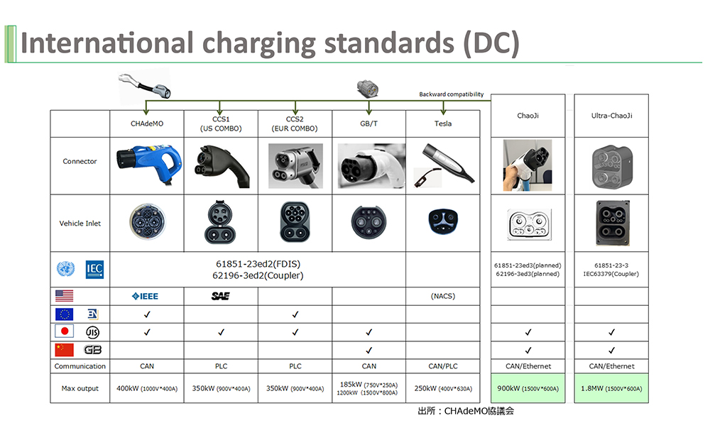 急速充電には世界に四つの規格がある。一つ目には、日本発で国際規格となった「CHAdeMO (チャデモ)」規格である。CHAdeMO規格は、これまで最大出力は50kWであったが、近年、航続距離の長いBEVが商品化され、大容量のタイプが計画されているため、「CHAdeMO 2.0」として最大出力350kW~400kWの仕様書をリリースしている。