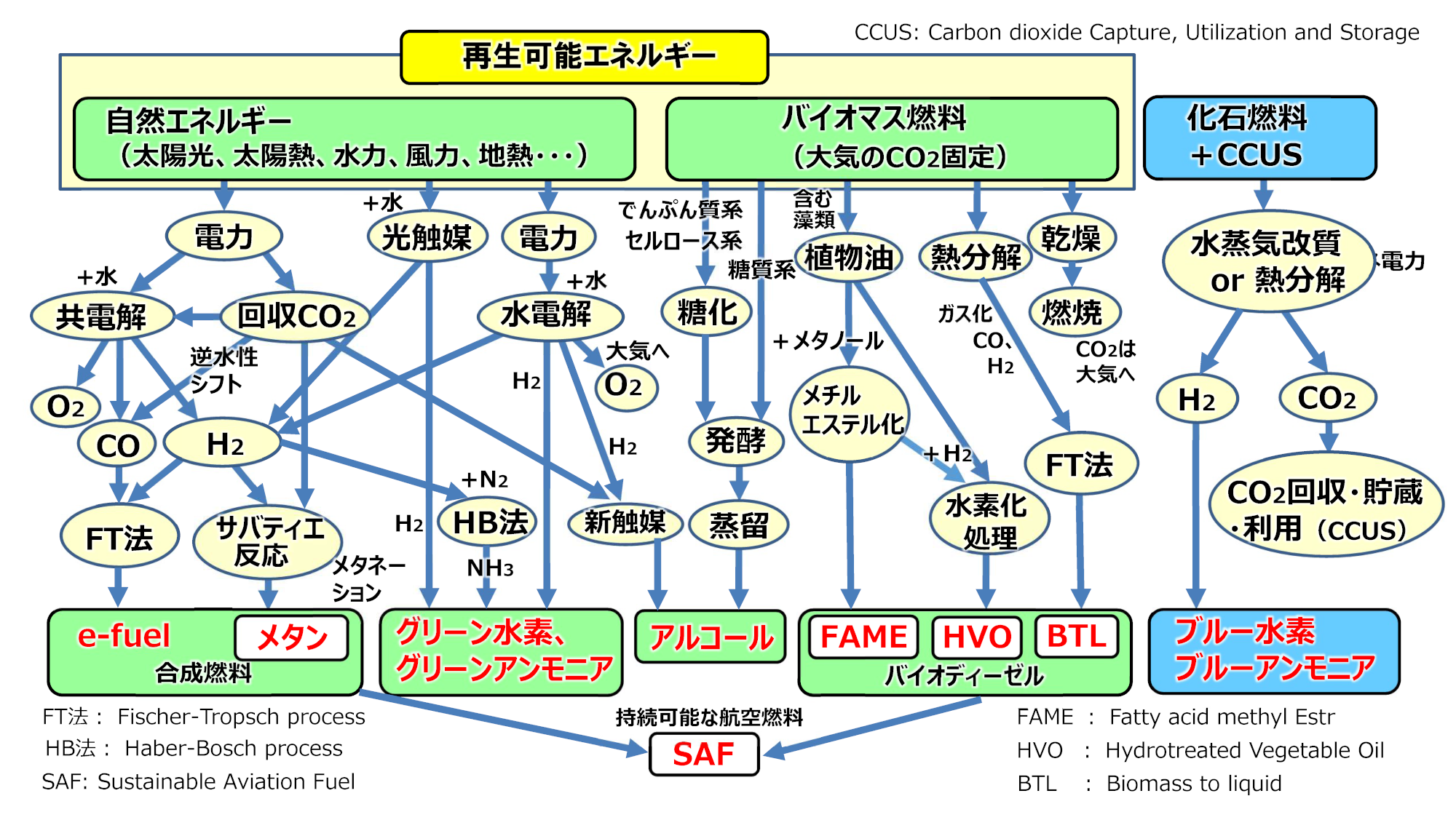 CN燃料には、再生可能エネルギー(再エネ)由来の電力によって製造された水素/アンモニア、再エネ電力による合成燃料(e-fuel)、バイオ燃料などがある (図3)。e-fuelは、工場排出や大気のCO2と水の電気分解による水素から再エネ電力でFT合成(Fischer‐Tropsch process)する。そのためにはCO2を大気から高効率で大量に回収するDAC(Direct Air Capture)技術の普及が重要となる。バイオ燃料には、サトウキビなどを発酵したバイオエタノールや、また植物油をエステル化したFAME(Fatty acid methyl ester)、さらに水素化処理をしたHVO(hydrotreated Vegetable Oil)と呼ばれるバイオディーゼルがある。