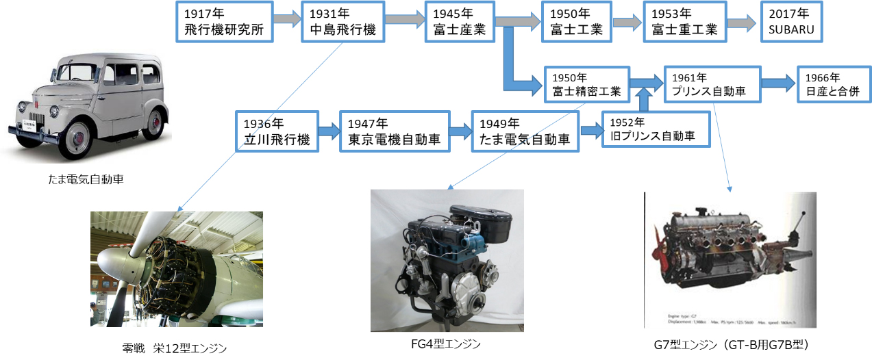 1966年にプリンス自動車と日産自動車が合併し両者の技術が融合することとなった。プリンス自動車の合併までの経緯とそのエンジンの系譜を図1に示す。