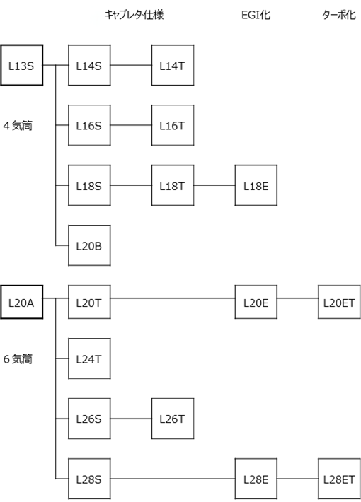 G型⇒H型⇒R型(シルビアCSP311型搭載)⇒H20型⇒U20型(フェアレディーSR31型搭載)⇒FJ20型(スカイラインDR30型搭載)。