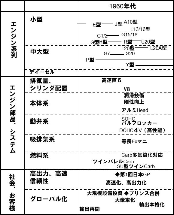 1960年代に入ると、高回転、高出力化に向けて、小型はE型、J型、L型、中大型はP型、Y型等とエンジンバリエーションを急速に拡大していった(表1)。