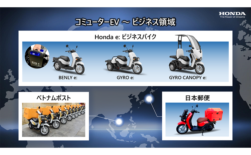 また、これらを市中設置型のバッテリ充電器と共に活用したバッテリシェアリングサービスによる、より効率的なエネルギーの活用方法も推進している(図4)。バッテリを共用として運用管理することで、バッテリと電動製品それぞれの稼働率を上げ、充電している時間が不稼働時間となる固定式に比べてよりエネルギーを効率的に使うことが可能となるため、二輪車だけでなく、三輪車やマイクロコミューターなどと共用していくことも可能となる。特に稼働時間の長い業務用途での活用に優れており、これらのモデルは既に日本郵便様を中心に活用いただいており、ベトナムポスト様でも展開し始めている(図5)。