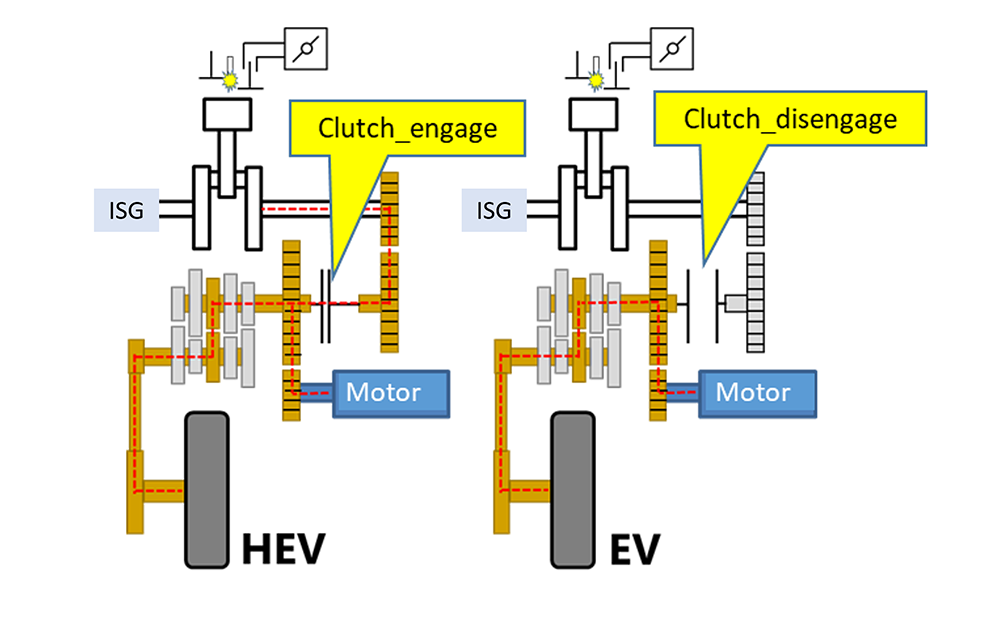 図2に示すようにエンジンとモータの間にクラッチを設置することで、走行シチュエーションによりエンジン走行、モータ走行、ハイブリッド走行の切り替えを可能としている。スロットル入力や車速といった車両情報に応じてECUがOCV(Oil Control Valve)を制御している。クラッチが結合された場合はエンジンの動力が後輪まで伝達されてエンジン走行またはハイブリッド走行となり、クラッチが切断された場合はモータ走行となる。