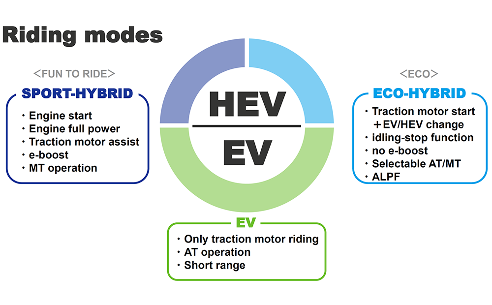 図3に示すようなSPORT-HYBRIDモード、ECO-HYBRIDモード、EVモードをライダーが任意に切り替えられるようになっている。SPORT-HYBRIDモードでは「e-boost」を使用することでモータからの出力を最大限取り出しパワーフィーリングを楽しむことが可能となっており、ライダーの好みに応じた走行が可能となっている。一方でECO-HYBRIDモードではギヤチェンジやEV・HEVモードの切り替えを自動的に行うことで、700 cm3並みの駆動力を発揮しながら従来の250cm3モデル並みのCO2排出量である86g/kmの低エミッション性能を実現している。またEVモードではガソリンエンジンを停止させることでゼロエミッションでの走行を可能としている。