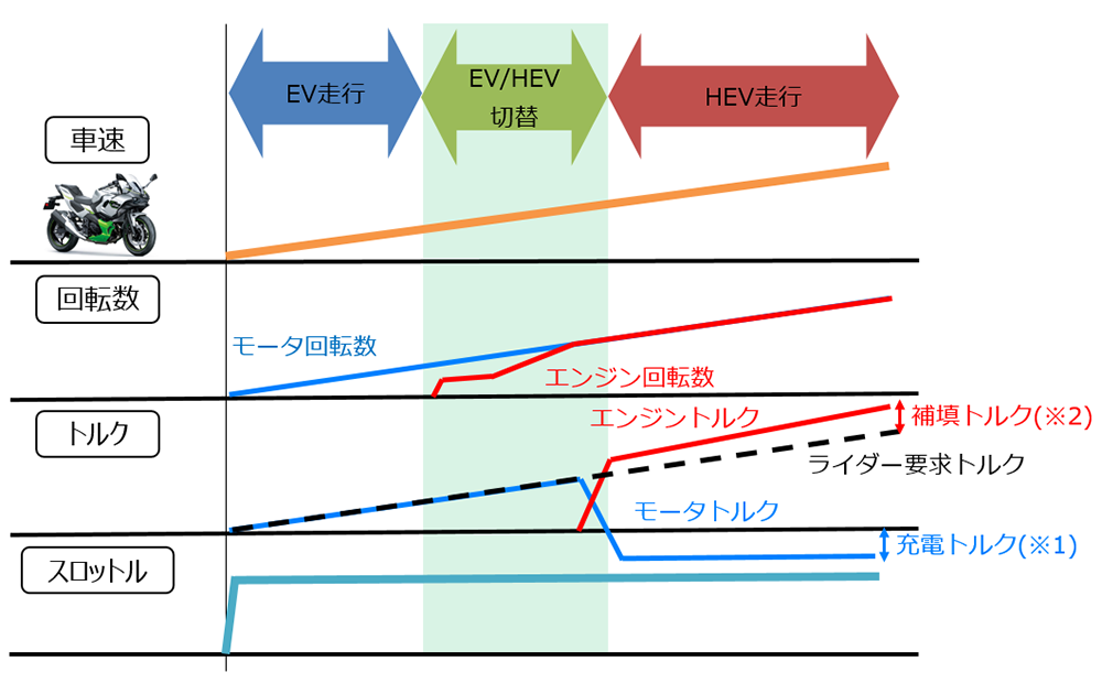 また、加速中のライダー要求トルクに対しエンジンへのトルク指令では不足している場合、不足分を駆動モータへトルク指令して、エンジントルクに対してモータトルクをアシストすることで加速感を損なうことなく走行を継続できる。