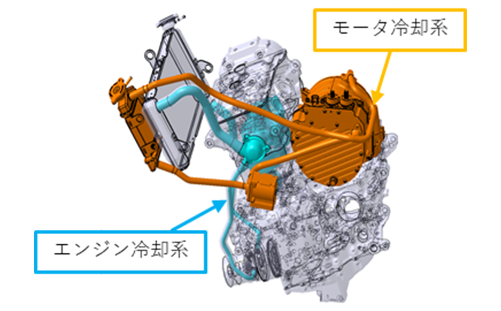 二輪車は搭載スペースが限られており運動性能を維持するために可能な限りマスを集中化させる必要がある。そのため、駆動モータは熱的には不利な位置となるがエンジンのクランクケース上にマウントしている。この配置によりエンジンからの受熱やモータからの放熱が課題となる。図5に示すように冷却方式をエンジンとは独立したラジエータ、ポンプを備えた水冷式とすることで、エンジンからの熱影響を低減させることができる。またモータとインバータを一体化することで冷却系を共有することが可能となり、コンパクトな構造を実現している。
