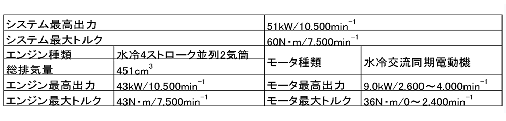 図1に示すように郊外ではエンジン・ハイブリッド走行することで従来のモーターサイクル同様の快適性を満足しつつ、市街地などにおいてはモータ走行することで静粛性・高い操縦性・エミッション低減を実現した。表1に本記事にて紹介する「Ninja 7 Hybrid/Z7 Hybridの主要諸元を示す。