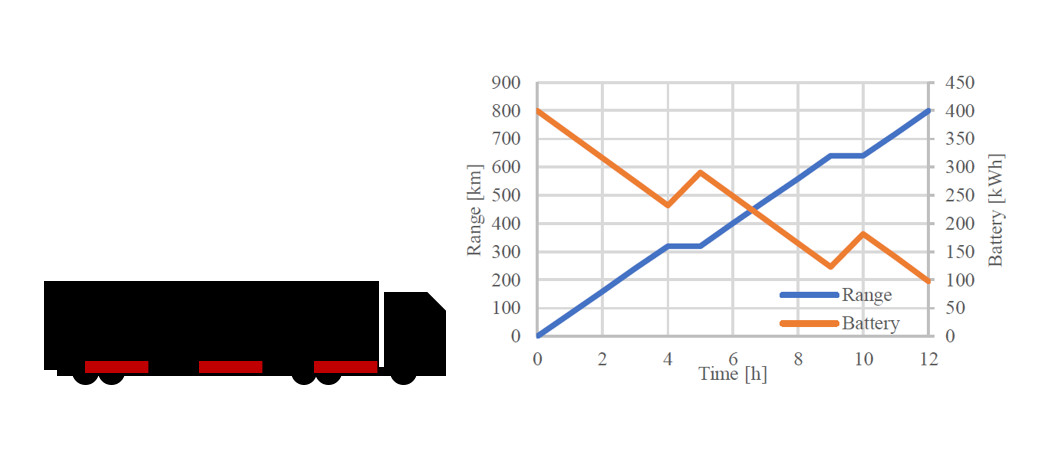 では、DWPTに必要な電力はどの位か? DWPTに必要な電力に関しては、幾つかシナリオがある。乗用車のみとする場合、トラックのみとする場合、乗用車とトラックの共用を考えた場合等である。また、インターチェンジ(IC)に入るときの充電率(SOC:State of Charge)とICから出るときのSOCの考え方がある。ここでは、乗用車とトラックの共用を考える。また、ICから入った時のSOCは100%でICから出たときのSOCが1%でもあれば良いとする。トラックはIC近くに拠点が多い事を理由とする。この前提に立って計算すると800km走行のトラックに受電コイル3個装着し、平均22kW×3個=66kWのDWPTレーンを導入すれば走りきれる試算を得られる(図2)。トラックは4時間毎の30分の休憩が義務づけられているので、この仮定ではそこでの停車中充電を行っている。400kWh搭載バッテリにおいて終着点で100kWh残せたので終着点でのSOCは25%となった。将来の自動運転時代は荷物を載せ替え後にすぐに出発するので、ICから出たときのSOCは100%にするべきかもしれない。その時代になれば、給電区間を拡充すれば良い。