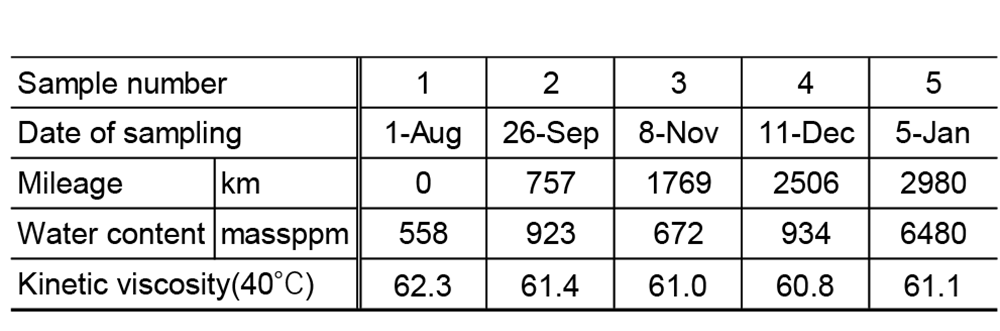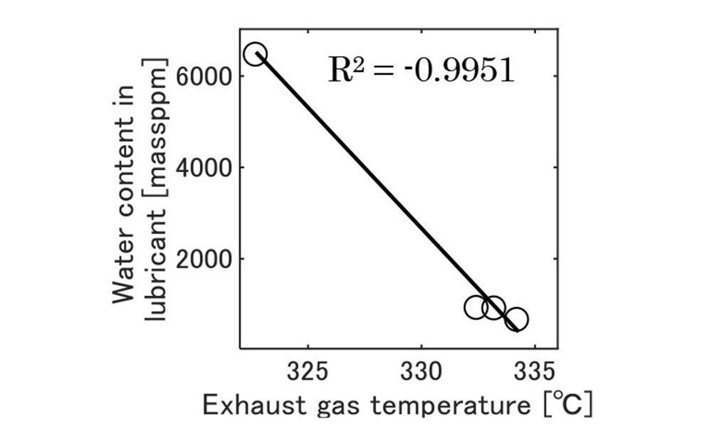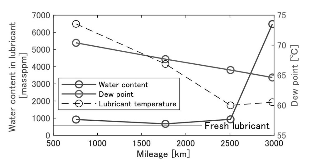 桧山(1)らは水素エンジンの潤滑油中の水分増加に着目し、周囲温度や湿度、潤滑油温度、排気ガス温度が水分含有量に与える影響を確認するため、中型トラックを用いた実路実験を8月から1月にかけて実施し、潤滑油を定期的にサンプリングした。