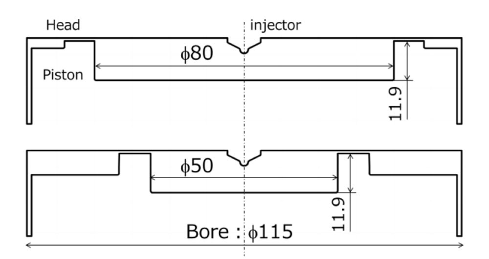 そこで本研究は、エンジン内において、1. エントレイン、2. 壁面、3. 隣接噴霧火炎間、の3種の干渉がそれぞれどの程度寄与度をもって燃焼に影響しているかを明らかしようとする非常に意欲的な研究である。干渉影響の評価の方法として、燃焼室内径(図2)、ノズル噴射方向(図3)を変化させた4パターンの燃焼を比較する事で、干渉影響を評価する。図4にその概略図と各干渉の分離方法を示す。