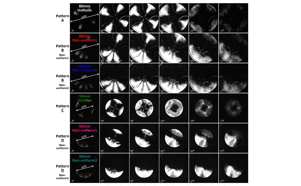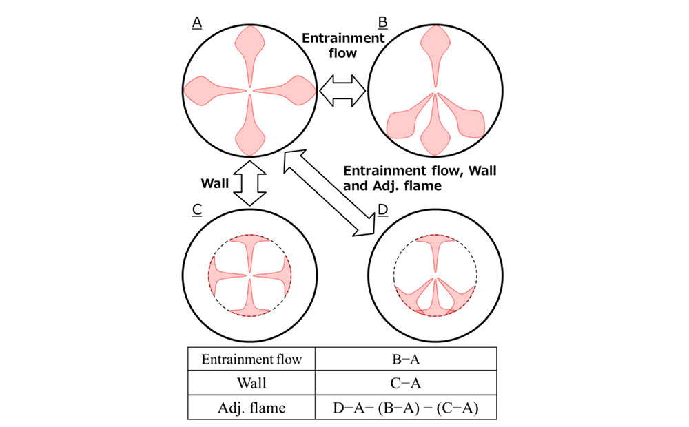 Aは、ベースとなる干渉の影響を含まない状態である。Bは不均等なノズル配置により、エントレインの干渉影響が含まれた状態となる。Cは、燃焼室内径を小さくすることにより、壁面の干渉影響が含まれた状態になる。Dは、エントレインと壁面に加えて隣接噴霧火炎を含んだ状態になる。