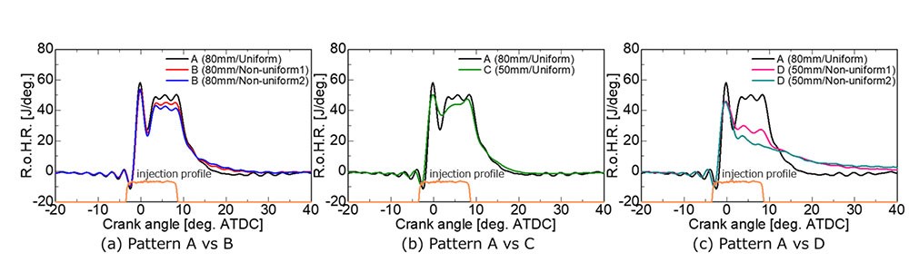 次に図5と図6に噴射圧力135MPaにおいて、燃焼室径とノズル噴射方向を変化させた場合の熱発生率の比較と筒内輝炎の可視化映像を示す。図5(a)の熱発生率は、図4のパターンAとBの比較であり、エントレインの干渉影響を比較している。エントレインが干渉することにより、拡散燃焼初期クランク角3度ATDC付近から燃料噴射終了時までの期間で不均等ノズルの熱発生率は均等ノズルよりも低くなり、干渉領域が広い不均等2は1より低下量が大きい。図6の同期間であるクランク角5度ATDCから8度ATDCの可視化画像を見るとパターンBのノズルにおいてはエントレイン干渉部の輝炎先頭がノズル近傍まで発生しており、空気導入が悪化していると考えられる。また噴射終了後の10度ATDC以降でも熱発生率に差がみられるが、これは燃焼室内径80mmとした場合においても噴霧火炎が壁面に衝突し、パターンBにおいては隣接噴霧との火炎間の干渉が発生してしまうためである。可視化画像でも壁面衝突後の隣接噴霧火炎との干渉領域において輝炎が長期間滞留している様子が観察されている。
