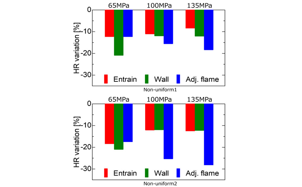 図7に噴射圧力を変化させた場合の各干渉(1. エントレイン、2. 壁面、3. 隣接噴霧火炎間)による発熱量の変化率を示す。上段が不均等1ノズル、下段が不均等2ノズルの結果である。