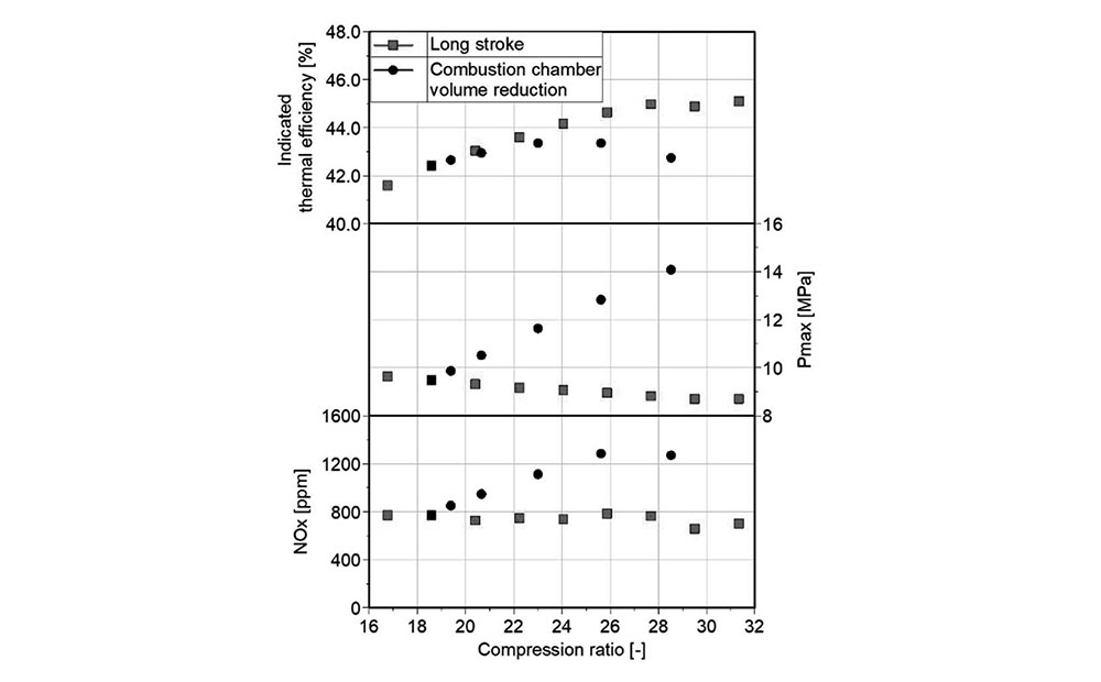 齋藤ら(1)は、熱効率向上に寄与する高圧縮比化の実現手段として、流動抑制などの課題がある燃料室の狭小化(BASE)ではなく、行程長さの延長(LS)による手段を検討した。KIVA-3VでのITE算出結果をみると、BASEは圧縮比24がピークだが、LSは圧縮比が高くなるに従い増加を示す。PmaxとNOxにおいて、圧縮比が高くなるに従いBASEは増加するが、LSは一定の水準を示した(図1-1)。単気筒エンジンでのBASEに対するLSのITEは、低負荷で+0.3pt、高負荷で+1.2ptの効果が得られた。同一回転数だとLSでは等容度が下がるため、燃焼後の高い温度・圧力の持続時間が短くなることが冷却損失低減の一因となりITEを向上させる(図1-2)。LSの機械損失の低下要因は、連幹比が低下したことによる摩擦損失は増加したものの、Pmaxが抑制されたためである。NOx排出量は、同一λではLSの方が増加する傾向となった。