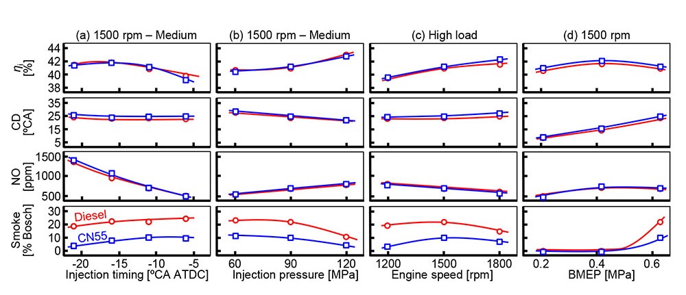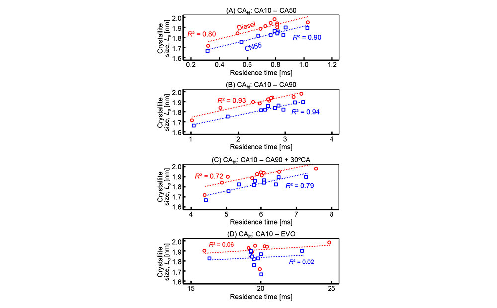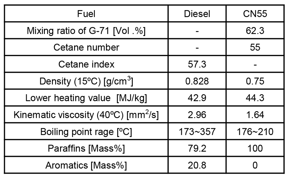 黒島ら(2)は、将来のCN燃料の燃料設計に寄与するため、セタン価や組成、物理的特性といった基本性状や機関の運転状態が、すすのナノ構造に及ぼす影響を詳細解析した。すす粒子のグラファイト化は酸化反応性を悪化させるため、DPFの強制再生に使用される燃料増加を招く。今回は燃料中のアロマ分に着目し、JIS2号軽油とセタン価を合わせたパラフィン系燃料(CN55)を用意した(表2-1)。粒子のグラファイト化度はラマン分光法、酸化反応性は熱重量測定により実施した。実機試験の結果、燃焼では筒内圧力、熱発生率に対する燃料の物理的特性の影響は小さいものの、性能では黒煙にてCN55が明確に少なくなったことは、アロマ分の差と考えられる(図2-1)。炭素結晶子サイズ(La)もCN55では小さくなることからメカニズムの解明を試みた。すす粒子の表面成長におけるアセチレン付加反応機構を前提に、燃焼状態での高温滞留時間とLaの関係性を推測し整理した結果、CA10-CA90とLaの相関が高く、Laは燃焼期間中に決定されると推定できた。LaはJISの方が大きいため、この要因はアロマである可能性が高い(図2-2)。