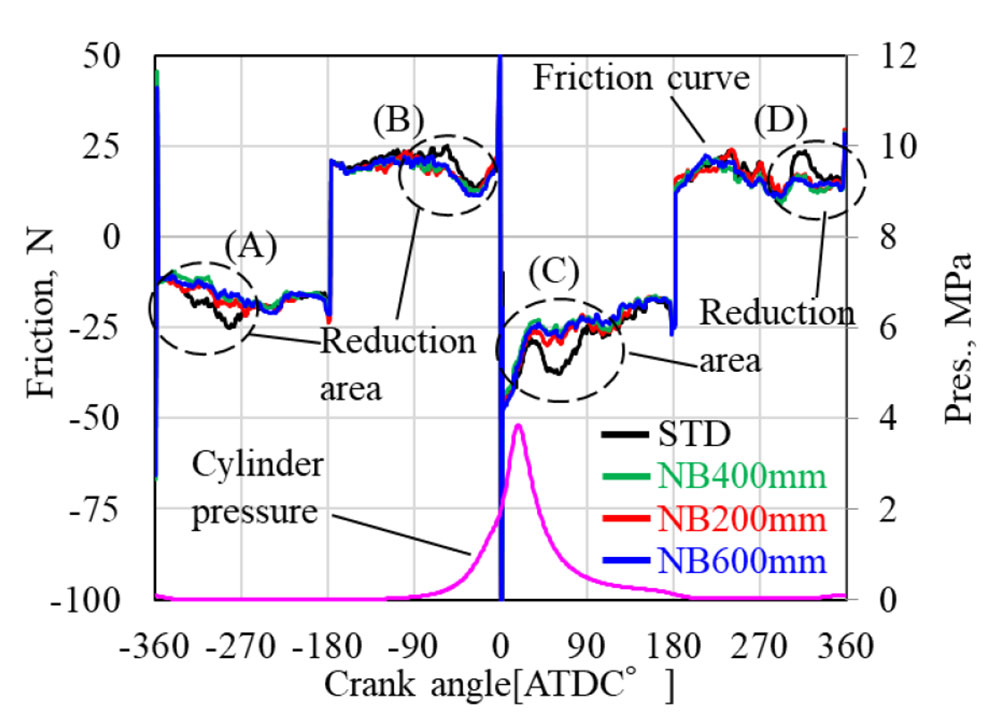 潤滑油による内燃機関の摩擦損失低減法として、本研究ではウルトラファインバブル(UFB。本稿ではナノバブル)を潤滑油に発生させて往復動摺動部での摩擦損失低減効果を調べている。堀場ら(1)は主に化学工学分野で活用が進む微細気泡のうち、超微細孔式により生成したUFBがピストン系摩擦力を低減する効果を調べており、図1に示すように図中点線で囲った領域のクランク角度のみ摩擦低減効果が確認され、バブル密度の増加によって摩擦は低減する傾向はあるが、上限は存在することが示唆された。1500rpmの実験結果例では高負荷程低減効果が高く、最大でFMEP(ピストン系摩擦平均有効圧力)が15%の低減結果が得られており、燃費向上に向けた効果も期待できる。今後は摩擦低減のメカニズム解明による更なる摩擦低減効果の実証を期待したい。
