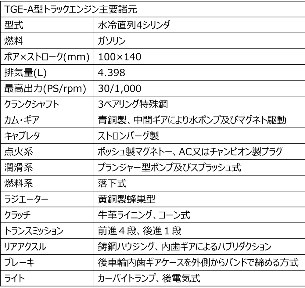 日野自動車の原点はガス器具会社「東京瓦斯工業株式会社」だ。2代目社長の松方五郎は、陸軍の「軍用自動車補助法」制定の動きをいち早く察知し自動車産業への進出を決意する。元請会社であった千代田瓦斯が、渋沢栄一の「東京瓦斯株式会社(現・東京ガス)」にシェアで敗れたためと言われている。TGE-A 型は、そのような経緯で生まれた純国産トラックであり、優れた独自設計・開発で日本初の保護自動車資格検定書を授与されている。