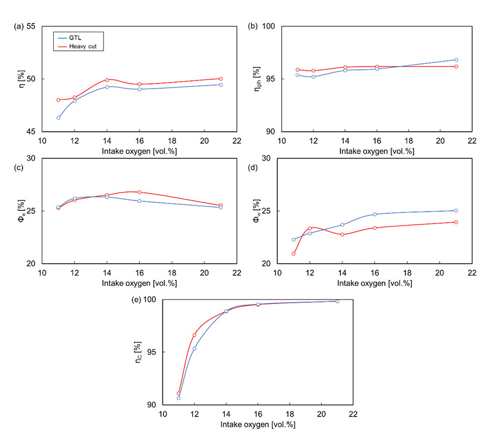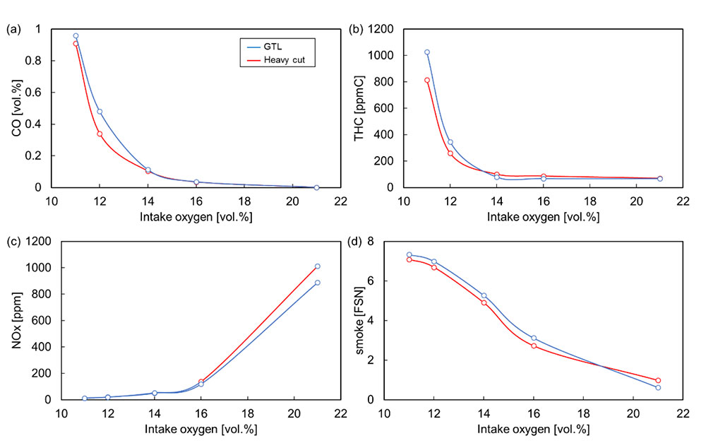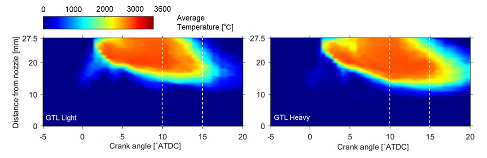 エンジン試験からは、セタン指数が低くなる軽質混合燃料(G50L50)ではパイロット着火遅れは増加する一方で熱損失の低減によって熱効率の改善が確認され、その要因は燃焼の可視化から、図1の2色法解析した視野内温度分布が示すように重質燃料では高温領域が外縁部に長期間滞留することによるとした。この結果から著者らは最適燃料性状としてGTL Heavyのみ含まないHeavy cut燃料を選択し、図2・図3に示すようにベースのGTLと比較し高熱効率や低スモークを実現することを確認した。