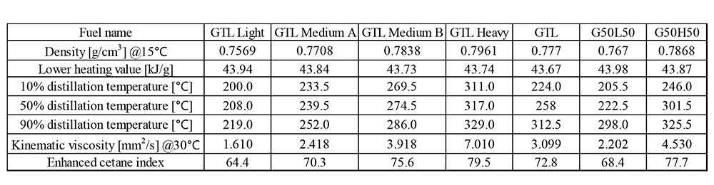 将来ディーゼル用合成燃料として期待されるGTLは多様な性状を実現可能だが、実エンジンに対する最適性状に関する研究は未だ多くない。田中ら(1)はエンジン性能・排出ガス特性に及ぼす性状影響、特に本報では蒸留特性に着目し、表1に示すように単一GTL燃料を25%ずつ分画分留し、最も軽質な成分(GTL Light)、最も重質な成分(GTL Heavy)について単気筒エンジン(それぞれを分画分留前のGTLと50:50で混合したG50L50、G50H50を使用)と燃焼観察用の急速圧縮膨張装置(GTLと混合せず)にて比較考察した。