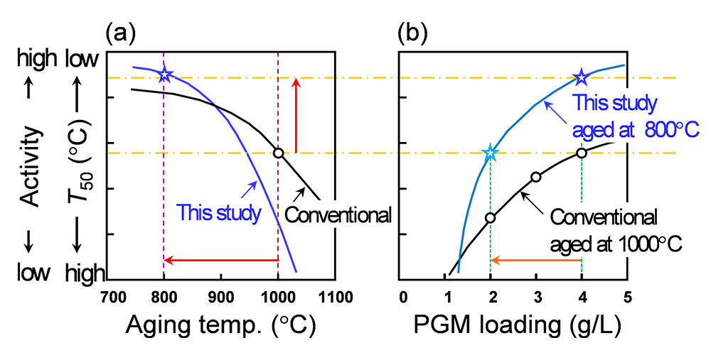 次世代エンジンの高効率化や電動化の進展は排気温度の大幅な低下を招くため、低温始動時の排気浄化が課題となる。一方で排気温度の低下は触媒熱負荷の低減を意味する。例えば、排気温度が最高800℃であれば、1000℃程度の耐久性が必須とされる現行TWCとは異なる組成・構造によって、より優れた低温活性を発現できる可能性がでてくる(図1(a))。同様に耐久温度が800℃まで下がれば、より少ない貴金属使用量で現行TWCと同程度の浄化性能を達成できると期待される(図1(b))。本研究では、このアプローチとして貴金属-卑金属複合化触媒に着目した。