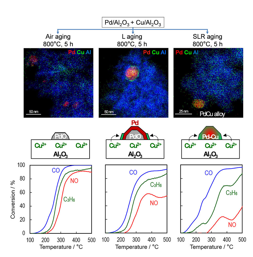 Cuと貴金属の複合化Cu、NiおよびCoなどの卑金属は、TWC条件ではNO還元活性が乏しいが、COおよびC3H6酸化に高活性を示す。Cu/Al2O3はair雰囲気であれば熱処理後も熱劣化しにくいため、Pd/Al2O3との粉体混合物について検討した。混合触媒は800℃でair耐久後は劣化の程度は小さいのに対して、より酸素濃度が低いL雰囲気やSLR雰囲気での耐久ではNO浄化性能が急激に低下した(図2)。電子顕微鏡で熱劣化機構を調べたところ、air耐久後はCu2+がAl2O3中に固溶しているが、L耐久後はCuがPd粒子周辺に析出し、SLR耐久後はCuPd合金が形成した。すなわちSLR耐久による顕著なNO浄化能の低下は活性点となるPd金属がCuと合金を形成するためと推定される(1)。