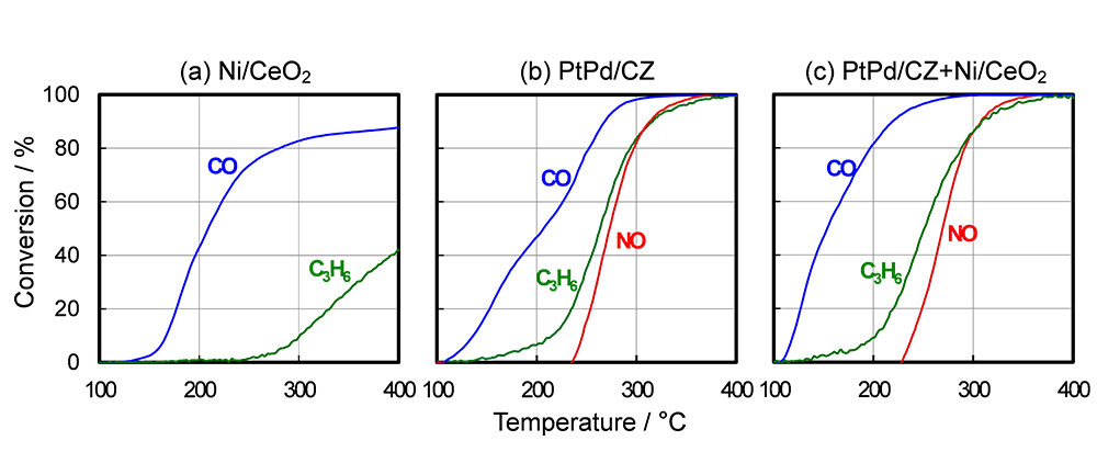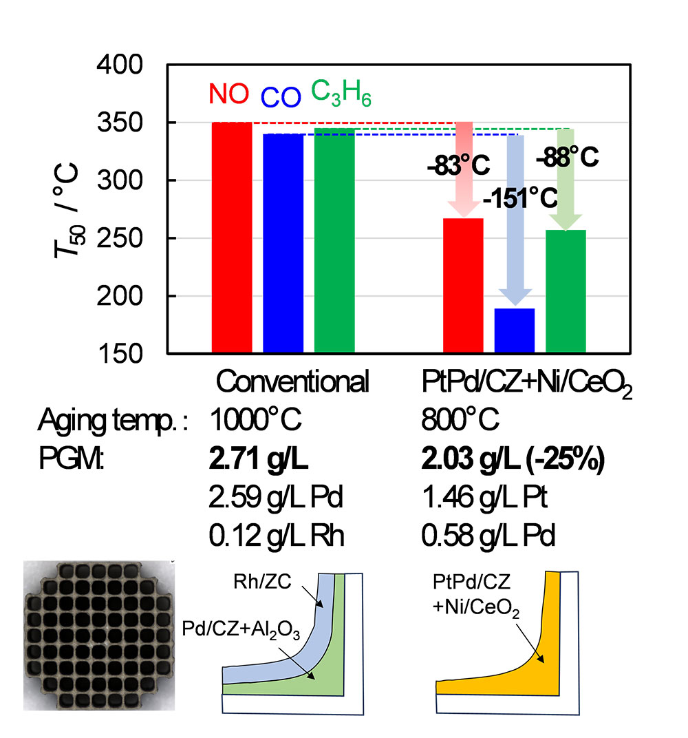 貴金属と卑金属との複合化においては、正負両方の効果が表れるのは避けられず、正の効果(活性向上)を引き出すと同時にいかに負の効果(劣化)を抑えるかが鍵になる。PtPd/CZ+Ni/CeO2の組み合わせは、両条件を満足する数少ない複合化触媒の候補である。ただし、耐久後の初回ライトオフやLean条件でのライトオフではまだ目標である貴金属25%削減と触媒活性化温度70℃以上低減を同時に満足しておらず、今後さらなる性能向上を目指して引き続き検討していく予定である。