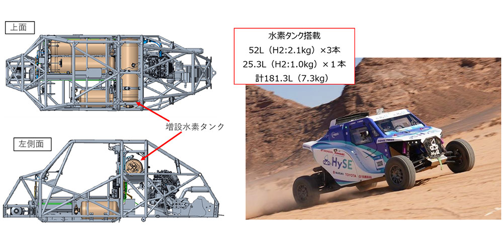 挑戦の舞台となる“Mission 1000 ACT 2”は、カーボンニュートラルに向けた技術開発を促進するカテゴリーである。水素エンジンやEVおよびこれらのハイブリッドシステムを搭載した車両が参加し、約1000kmの走破に挑戦する。2年目となる本年は、より実用的な課題抽出を可能とするために、高負荷使用率および航続距離の向上を図った「HySE-X2」を投入した。エンジン適合の最適化により2024年の課題であったエンジンの高出力化を実現し、エンジン使用領域を柔軟に選べるようにエンジン内のトランスミッションを運転席から変更できる機構を追加した。さらに、水素タンクを3本から4本に増設し、前述の出力特性の改良を実現しながら航続距離の向上も図った(図1)。