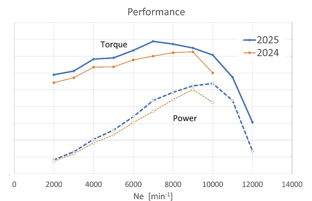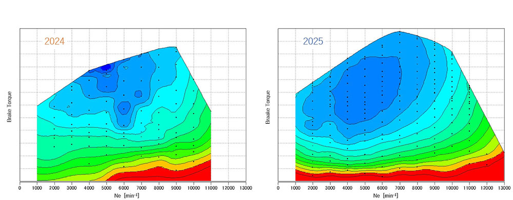 HySE-X2に搭載する水素エンジンはカワサキ製998cm3遠心式過給機付き4気筒エンジンを気体水素燃料用に変更したもの(図2)である。2024年に高回転運転の障害となっていた現象の対策として一部の電装部品を変更してある。高回転運転時に懸念となる水素インジェクタへの電流供給能不足を補うためDC/DCコンバータにより昇圧する補助回路を追加した。制御適合においては部分負荷域での燃費改善を狙い、低負荷領域の当量比を昨年よりも小さくしリーン燃焼とした。これにより広いエンジン運転領域で熱効率の向上を実現した(図3)。また、点火時期、噴射時期の見直しにより全回転数領域で最大トルクの向上を達成し運転可能領域は昨年比2000min-1拡大した(図4)。
