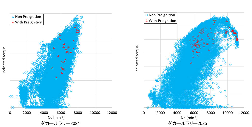 ダカールラリー参加によるデータ取得結果図5にダカール2024、2025で取得した使用領域のプロットを示す。運転可能領域拡大とギヤシフタの追加により2025年はより広範の実走行データを取得できた。水素エンジンはガソリンと比較して点火時期より早期に着火する異常燃焼(プレイグニッション)が発生しやすく、この抑制が課題の一つとなる。図5は通常燃焼を〇、プレイグ発生時を△で表しており、6000min-1以上の特に高負荷においてプレイグが発生していることが確認できる。前述したように、2025年は最大トルク比50%以下の領域をリーン側にセッティングしたことで50%以下の負荷領域でも発生していたプレイグが抑制できたと考えているが、高負荷領域のプレイグは依然抑制できていない。現在プレイグの発生原因のすべてが明らかになっていないため、今後は発生原因の解明に取り組む計画である。