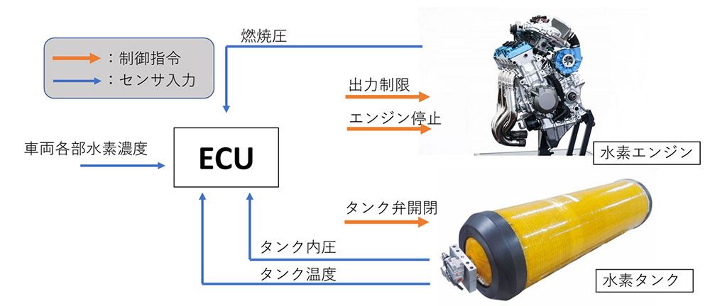 水素セーフティ制御HySE-X2は高圧水素ガス燃料を使用する。水素リークなどの異常を検知するとエンジン停止とタンク弁を閉じるシステムとなる。また燃料消費による断熱膨張でタンク温度が大きく低下すると樹脂タンク破損のリスクがあるため、タンク温度を監視し必要に応じて燃料消費を抑えるロジックを実装している(図6)。ダカールではアクセル全開走行を長時間続けるという区間があり、冬のサウジアラビアの低温の影響も重なり出力制限が作動する場面があり、過酷な環境下での燃料消費とタンク温度の関係についてのデータを取得することができた。プレイグ発生においても、発生の抑制やエンジン保護に関する制御において課題が見られた。