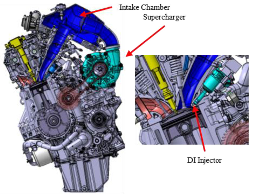 和泉ら(1)は、「過給直噴水素エンジンの燃焼可視化」と題して発表を行った。排気量998 cm3、圧縮比8.5の2輪車用4気筒エンジンをベースに製作された直噴過給水素エンジンを用い、燃焼室内をボアスコープで可視化することで火炎伝播及びプレイグニッションの観察を試みた。エンジンの外観を図1に、ボアスコープによる可視域を図2に示す。